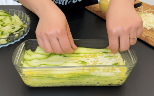 U narednom koraku pocinjete sa slaganjem i pecenjem. Prvo nauljite pravougaonu posudu koristeći maslinovo ulje, vodeći računa da ne ostanu suhi dijelovi. Ovo će spriječiti lijepljenje hrane za dno. Počnite sa jednim slojem tikvica – neka se trake malo preklapaju kako bi se stvorila čvrsta podloga. Preko tog sloja ravnomjerno prelijte polovinu smjese od jaja i mleka, pazeći da se rasporedi do svih ćoškova.