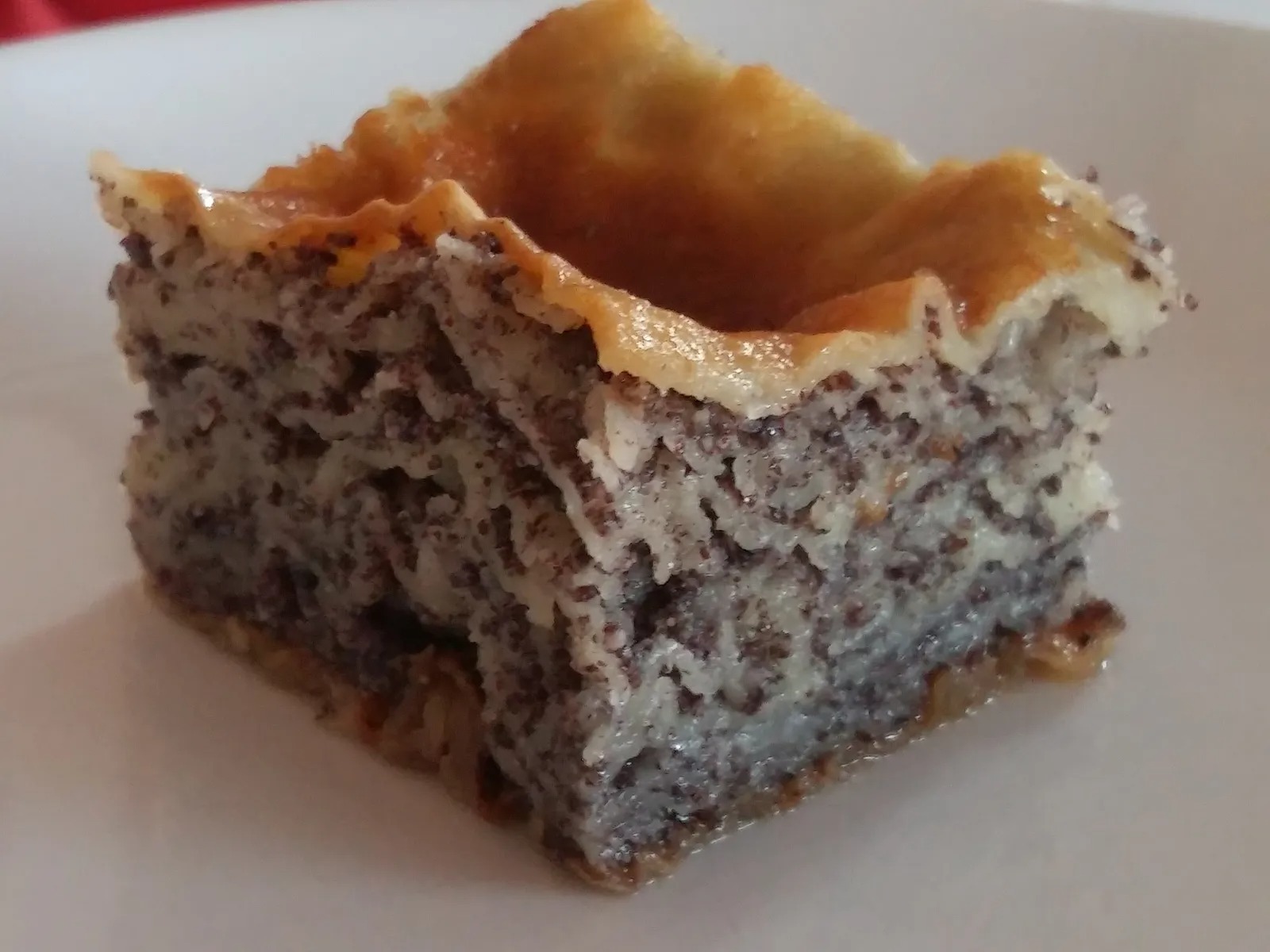 U ostatak smjese dodajte mak i premazivanje kore u nauljenoj tepsiji,pocnite i zavrsite s dvije nepremazane kore.