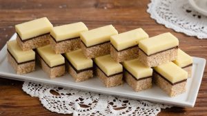 U šerpi stavite mlijeko da se lagano zagrije na tihoj vatri. U mlijeko dodajte margarin i miješajte dok se potpuno ne otopi. Kada se postigne homogena, tekuća smjesa, dodajte se šećer. Tek kada su svi sastojci lijepo sjedinjeni i bez grudvica, dodaju se mljeveni keksi i kokos. Ova dva suha sastojka brzo upijaju tekućinu i formiraju masu nalik tijestu. Smjesu rasporedite u kalup dim. 20×20 cm i dobro poravanjte. JAko je bitno da smjesa bude ravna kako bi vam presjek izgledao dobro. Kada ste poravnali stavite kalup u frižider i nastavljamo da daljnom priprmeom.