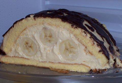 Na taj dio biskvita slozite uzduz 4 banane te opet premazite kremom ina to dodajte jos 2 banane.