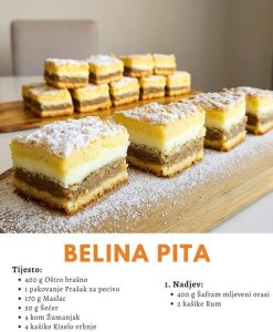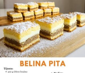 Sada krećemo sa izradom drugog nadjeva. Bjelanjke izmiksate u čvrsti snijeg a zatim postepeno dok jošmiksate dodoajte šećer zatim griz pa kada sve izmiksate dodat ćete i svježi sir. Sve sjedinite pažljivim miješanjem kako bi se sačuvala vazdušasta struktura, što će doprinijeti laganijoj teksturi gotove pite.