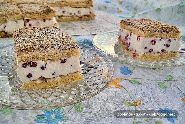 U zdjeli jenasto umutite puter zatim dodajte secer, vanilin secer i koricu limuna. U smjesu dodajite jedno po jedno zumance a zatim dodajite postepeno brasno u smjesu. Treba da dobijete ljepljivo tijesto. Tijesto razvucite po plehu dim. 28×24 cm koji ste prethodno oblozili pek papirom. Bjelanca izmiksajte sa malo soli. Izmiksajte bjelanca u cvsrti snijeg. Zatim u bjelanca dodajte secer te miksajte dok se secer ne otopi. Snijeg od bjelanca podijelite na 2 dijela te premazite prethodno napravljene kore. Kore pospite sa mljevenim bademima i pecite u zagrijanoj rerni na 170 stepeni oko 25 minuta. Ako bi bademi poceli goriti kore prekrijte sa alu folijom. Gotove kore izvadite iz kalupa. Slatku pavalaku izmiksajte sa slagfixom i prah secerom. u izmiksanu smjesu latke pavalke dodajte ribizle te smjesu dobro izmijesajte. Filom premazite koru te preklopite sa drugom korom. Isjecite na kocke zeljene velicine i uzivajte!