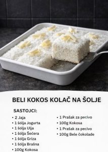 Ova kombinacija daje specifičnu teksturu – griz obezbeđuje blagu zrnastu strukturu, kokos unosi aromu i punoću, dok brašno i prašak za pecivo omogućavaju da kolač lepo naraste tokom pečenja.