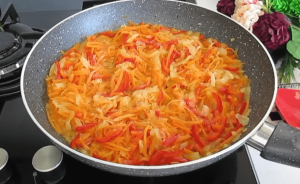 U tavi u koju ste dodali amlo ulja i zagrijali na srednje jakog vatri dodjte luk koji ste isjeki na sitne kockice i dinstatje dok ne postane staklast. Kada ste prodinstali luk dodajte i naribanu mrkvu. Kada je mrkva omekšala dodajte i crvenu papriku koja će ovom jelu dati posebnu aromu. Pred sami kraj dinstanja se dodaje sitno sjeckani peršin, kao i malo soli i bibera, a zatim se smjesa sklanja sa vatre da se blago ohladi.