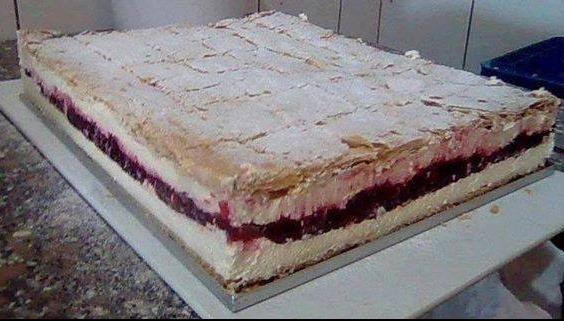 Izlupajte slatko vrhnje i slazite ovim redoslijedom: kora-fil od višanja-slatko vrhnje-kora-fil od višanja-slatko vrhnje-kora.