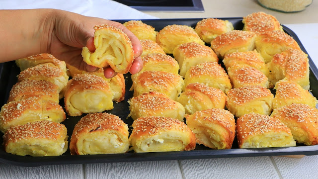 Premijesite i podijelite na cetiri dijela. Svaki dio razvucite i filujte umucenim maslacem sa jajetom. Odozgo stavite sir,umotajte i sijecite ukoso da dobijete trouglove.