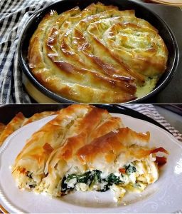 Kada je pleh napunjen, pita se odozgo premaže sačuvanom smjesom od jaja i jogurta. Ovaj premaz pomaže da kora dobije lijepu, sjajnu i zlatno-smeđu koricu tokom pečenja.