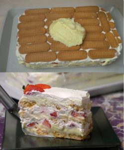 - Cijeli postupak se ponavlja – novi red keksa, pa fil, pa jagode, pa pavlaka.