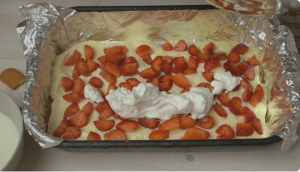 - Zatim slijedi sloj isječenih jagoda koje se ravnomjerno rasporede.