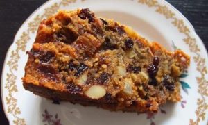 Dobro izmijesajte sastojke kako bi se komadići voća i orašastih plodova ujednačeno obložili brašnom. Ovaj korak ima vrlo praktičnu svrhu – zahvaljujući brašnu, voće i orašasti plodovi neće potonuti na dno tijesta tokom pečenja, već će ostati ravnomjerno raspoređeni po cijelom kolaču.