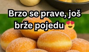 Zagrijte ulje u nekoj dubljoj posudi. Idealna temperatura je srednja – dovoljno vruća da krofne počnu da se peku odmah po ubacivanju, ali ne toliko da pregore spolja, a ostanu sirove iznutra. Pržite po nekoliko krofni odjednom, ali pazite da imaju dovoljno prostora da se slobodno okreću. Kad porumene sa jedne strane, prevrnite ih i pržite još par minuta.