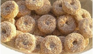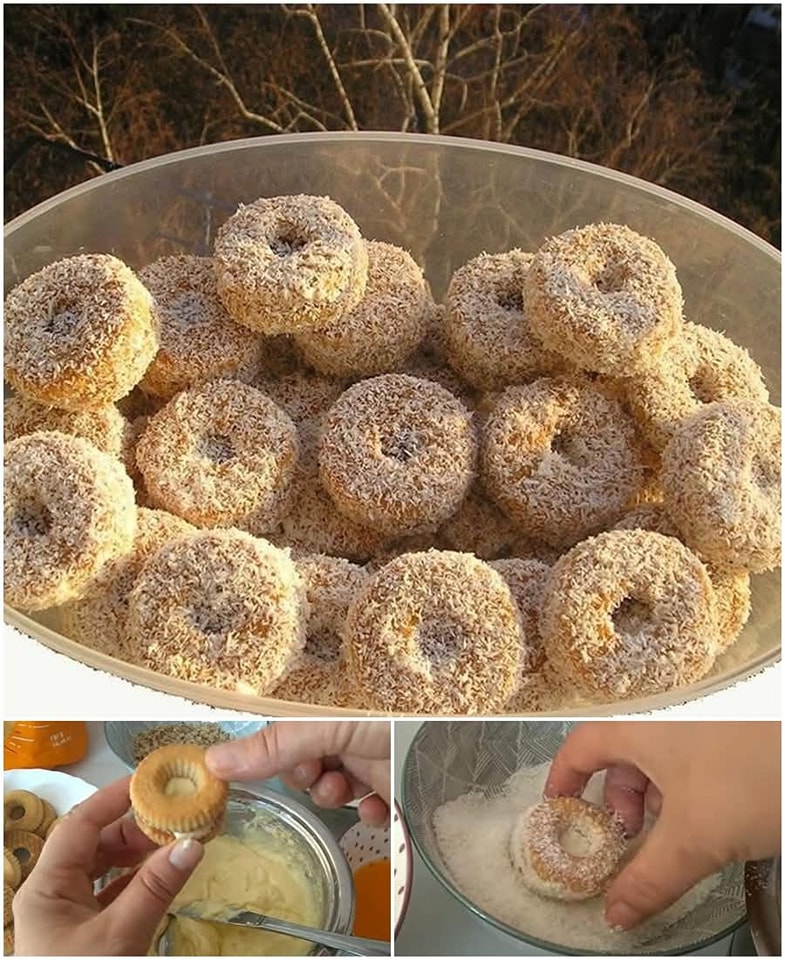 Gotove „sendviče“ uvaljati u kokosovo brašno sa svih strana, kako bi se fil lepo obložio kokosom i kolačići dobili prepoznatljiv, dekorativan izgled.
