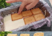 Kao završni korak, preko celog kolača pospe se mlevena kora koja je ranije sačuvana – to ne samo da daje dekorativni izgled, već i dodatnu teksturu pri svakom zalogaju. Kolač se zatim stavlja u frižider da se ohladi najmanje tri sata. Hlađenje omogućava da se svi slojevi lepo stegnu i povežu, kako bi se prilikom sečenja dobile uredne, čvrste parčad.