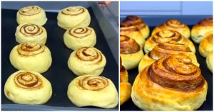 Nakon što tijesto naraste, podelite ga na dva jednaka dijela i oblikujte u kugle. Svaku kuglu ostavite da se odmara dodatnih 10 minuta pod krpom kako bi se lakše valjala. Zatim tijesto razvucite u pravokutnik dimenzija otprilike 30×40 cm. Maslac ostavite na sobnoj temperaturi kako bi omekšao. Tijesto se obilno premaže omekšalim maslacem, a zatim se posipa mješavinom cimeta i šećera. Potom se tijesto presavija u oblik koverte – jednom horizontalno, pa zatim vertikalno – te se ovaj postupak ponavlja s oba dijela tijesta. Nakon savijanja, tijesto se vraća na lim i ponovo prekriva krpom, ostavljajući ga da se odmori još 25-30 minuta.