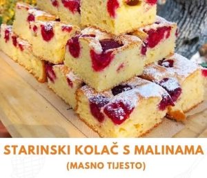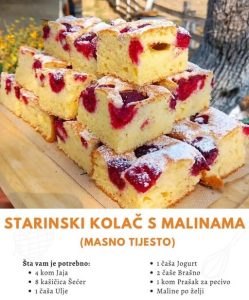 Kada dekorisete malinama stavite u vec zagrijanu rernu na 200 stupnejva. Vrijeme pečenja je oko 20 minuta, ali se preporučuje da kolač povremeno provjeravate. Gotov je kada poprimi zlatno-smeđu boju i postane čvrst na dodir.