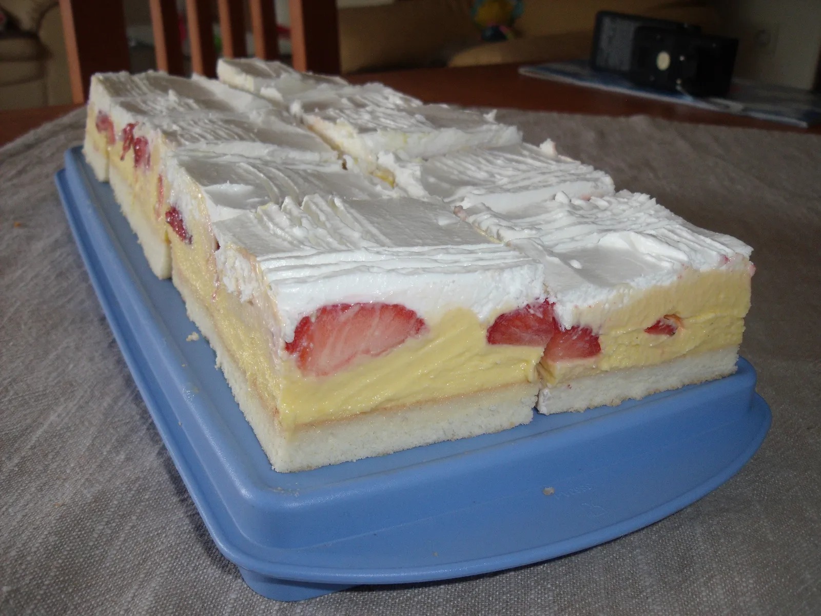 Slag napravite prema uputi proizvodjaca. Redajte kora, krema, u kremu ugusto utisnite jagode i na kraju slag.