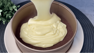 Jednu polovinu smjese utisnite u okrugli kalup za torte prečnika 20 cm, koji prethodno oblozite pek papirom. Prstima ili donjom stranom čaše ravnomjerno pritisnite sloj da se dobro sabije i stvori čvrstu podlogu. Kalup zatim stavite u hladnjak na hlađenje – dovoljan je kratak period, tek toliko da se donji sloj stabilizuje dok pripremate kremu.