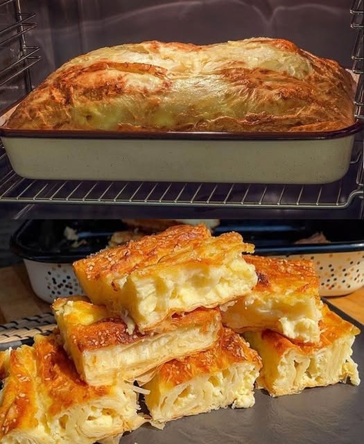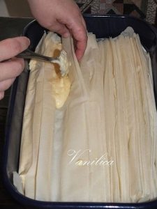 Smjesu koju dobijete polako izlijte preko harmonika-složenih kora. Nije neophodno da smjesa pokrije sve ravnomjerno, jer će tokom pečenja sama da prodre u sve nabore i time obogati svaku koru. Važno je da smjesu rasporedite lagano sa zlicom ili kutlacom, kako ne biste pomjerili slojeve.