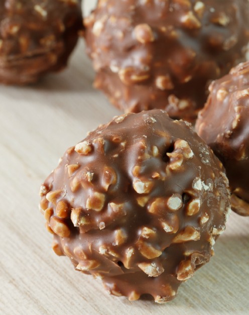 Cokoladu otopite sa tri zlice ulja. Od ohladjene smjese dlanovima formirajte kuglice otprilike kao orahe pa ih umocite u otopljenu cokoladu i stavite na pleh.