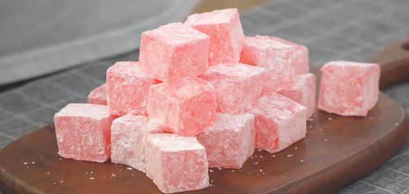 Krčkajte 30 minuta na laganoj vatri. nakon toga dodajte aromu vanile i boju za hranu. Umešajte. Četvrtast kalup obložite papirom za pečenje i četkicom umočenom u ulje premažite. Izlijte smesu. Nakon 3 h istresite iz kalupa i isecite na kocke. Uvaljajte u kukuruzni skrob.