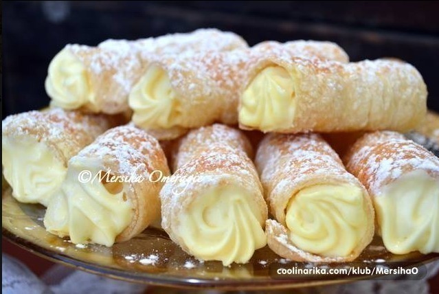 Bude dovoljno da savijete do pola kalupa. Redajte ih na oblozenu tepsiju. Umutite jaje s jednom zlicom vode i cetkicom preci preko rolnica. Pospite kristal secerom i stavite ih u zagrijanu rernu na 200 stupnjeva oko 15 minuta.