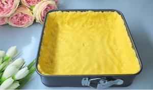 Pomijesajte sve sastojke u jednu posudu i dobro izmiješati kako bi se dobila ujednačena smjesa. Onda tu smjesu utisnite u pripremljenu posudu tako da stvori čvrstu i ravnomjernu bazu. Potom se podloga peče u vec zagrijanoj rerni na 160 stupnejva 10ak minuta dok blago ne porumeni i postane čvrsta. Kada se izvadi iz rerne, ostavi se kratko da se prohladi dok se priprema fil.