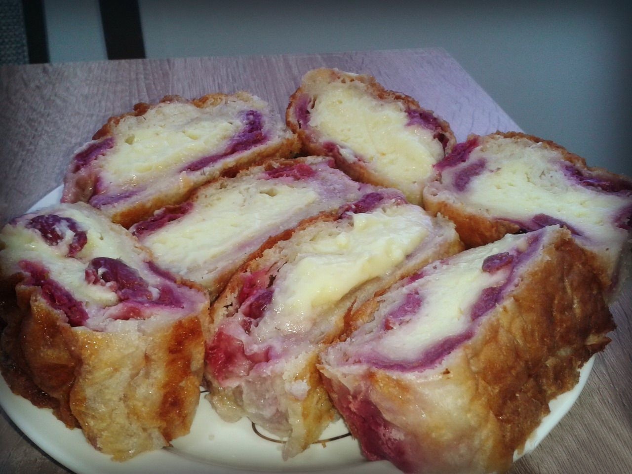 U zdjeli izmiksajte jaja sa secerom, vanailin secerom, gustinom i brasnom. U smjesu dodajte 12 kasika mlijeka aostatak stavite da zakuha. Smjesu dodati u prokuhalo mlijeko i mijesati dok se me zgusne. U toplu kremu dodajte margarin isjecen na kockice i mijesajte dok se ne otopi i ne sjedini sa kremom. kremu ostavite da se ohladi. Mikserom izmiksajte jaja sa secerom, a zatim dodajte ulje i jogurt, dobro izmiksate te na kraju dodajte griz sa prasom za pecivo. Smjesu dobro izmijesati da se dobije jednolcina smjesa. Za fil je potrebno da visnje pomijesate sa secerom i grizom. na radnu plocu stavite stavite jednu koru. Koru premazite sa 4 kasike smjese za premazivanje. preko te kore stavite drugu koru te takodjer premazite sa filom za premazivanje. Stavite trecu koru. Kremu od vanilije podijelite na 3 jednaka dijela. jedan dio kreme premazite preko trece kore ali samo na jedan kraj kore. Po kremi rasporedite trecinu visanja. Kore presavijte sa stren kako vam krema ne bi iscurila te zarolajte u Strudlu. Strudlu prebacite u tepsiju koju ste oblozili pek papirom te ponovite postupak sa preostale dvije strudle.Pripremljene strudle premazite sa uljem. Strudle pecite na 180 stepeni oko 20 minuta. za kraj pecene strudle mozete posuti sa prah secerom. Uzivajte i prijatno!