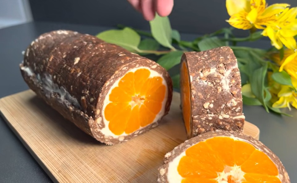 Filujte mjesavinom sira i meda pa uz jednu ivicu uspravno poredajte ociscene mandarine jednu do druge. pazljivo urolajte uz pomoc papira. Ako je potrebno uklonite visak fila sa ivice podloge od keksa kako bi se bolje pricvrstila za rolat.