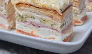 – Četvrta kora se premazuje kremom, onda se posipaju sitno iseckani kiseli krastavčići. Njihova svežina i kiselost stvaraju savršen kontrast prethodnim slojevima.