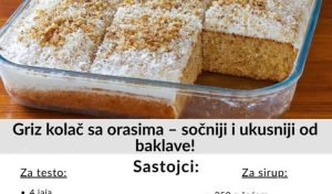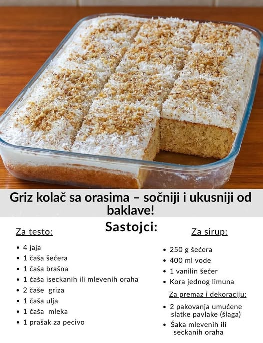 Kada sjedinite tecne sastojke, postepeno se umiješaju suhi elementi: brašno, griz i orasi. Sve se lagano miješa kako bi smjesa ostala prozračna, a na samom kraju se dodaje prašak za pecivo, koji će omogućiti da kolač lijepo naraste tokom pečenja. Dobijena smjesa treba biti srednje gustine i bez grudvica.