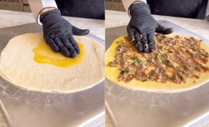 Za početak prvo je potrebno napraviti tijesto. U malo veću zdjelu sjedinite sve suhe sastojek koji su potrebni za tijesto a to su brašno, so i prašak za pecivo. Sastojek izmiješajte rukom kako bi se sjedinili a zatim dodajte vodu, mlijeko i jogurt. Umiješajte mijeso drvenom kašikom a kada ste pomiješali sastojek tijesto je ptrebno daje miješati rukom.