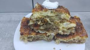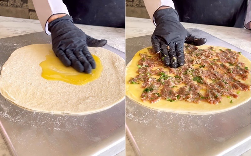 Kada je tijesto odmorilo, svaki komad se razvalja na dimenzije malo veće od tanjura za serviranje. Važno je razvaljati tijesto ravnomjerno kako bi svi slojevi bili jednake debljine. Na svaki sloj nanosi se dio uljno-maslačne smjese, a potom se ravnomjerno raspoređuje nadjev od mesa. Slojevi se slažu jedan na drugi tako da svaki novi list prekrije prethodni, s tim da se između svakog dodaje ulje i meso.