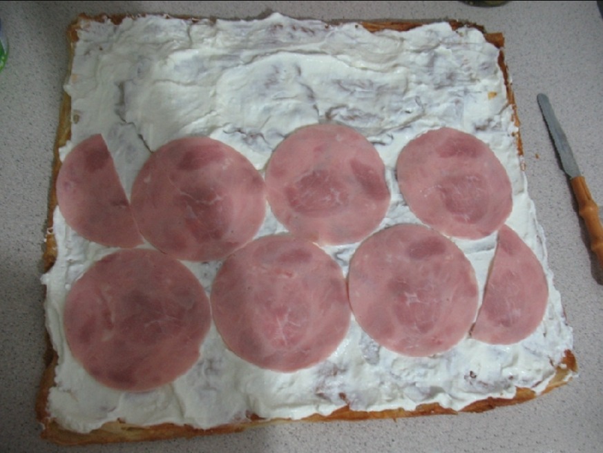 Rolate premazati ostatkom fila i preklopiti sa bočnim stranicama velike oblande. Ceo trougao premazati majonezom i posuti rendanim kačkavaljem.