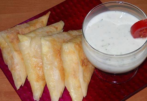 Na radnu plocu stavite isjecene trake pa premazite sa malo smjese za premazivanje. Prekrijte drugom trakom. N jedan kraj stavite 1 zlicu fila sa sirom. Preklopite pa nastavite preklapanje oblikujuci trokutice.