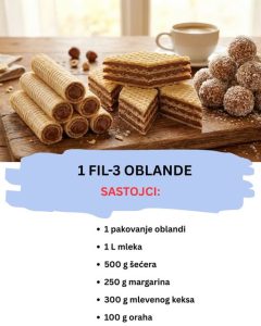Za ovu oblatnu potrebna su vam tri lista oblande. Dva se ravnomerno premažu pripremljenim filom, nakon čega se treći list stavlja odozgo kao završni sloj. Vrlo vazno je staviti nešto teško preko njih – najčešće se koristi velika knjiga ili daska. Na taj način se oblande dobro slepe i dobiju ravnu površinu. Nakon što se potpuno stegnu, seku se na kocke ili tradicionalne rombove.