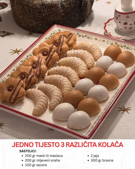 Nakon što ste dobili ujednačenu smjesu dodajte i mljevene orahe a na samom kraju ćete dodati i brašno vodeći računa da tijesto ostane mekano ali se ne smije lijepiti za ruke. Kada se dobije kompaktna masa, testo se umota ili pokrije i ostavi u frižideru najmanje pola sata. Ovo hlađenje je važno jer omogućava lakše oblikovanje i bolju strukturu tokom pečenja. Ohlađeno tijesto podijelite na 3 jednaka dijela.