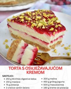 Kada završite slaganje, tortu je potrebno ostaviti u frižideru najmanje četiri sata, a idealno i duže, kako bi se svi slojevi lepo stegli i povezali. Tokom hlađenja ukusi će se sjediniti, a tekstura postati čvrsta i savršena za sečenje.