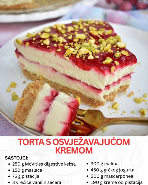 Krema je srce ovog deserta i zaslužna je za njegovu raskošnu teksturu. Za nju će vam biti potrebni grčki jogurt, mascarpone sir, krem od pistacija, šećer u prahu i instant želatina. U dubljoj posudi najpre sjedinite grčki jogurt i mascarpone, a zatim dodajte krem od pistacija. Mutite mikserom srednjom brzinom dok ne dobijete glatku i svilenkastu masu bez grudvica. Nakon toga dodajte šećer u prahu i instant želatinu, pa nastavite kratko miksanje dok se svi sastojci potpuno ne povežu.