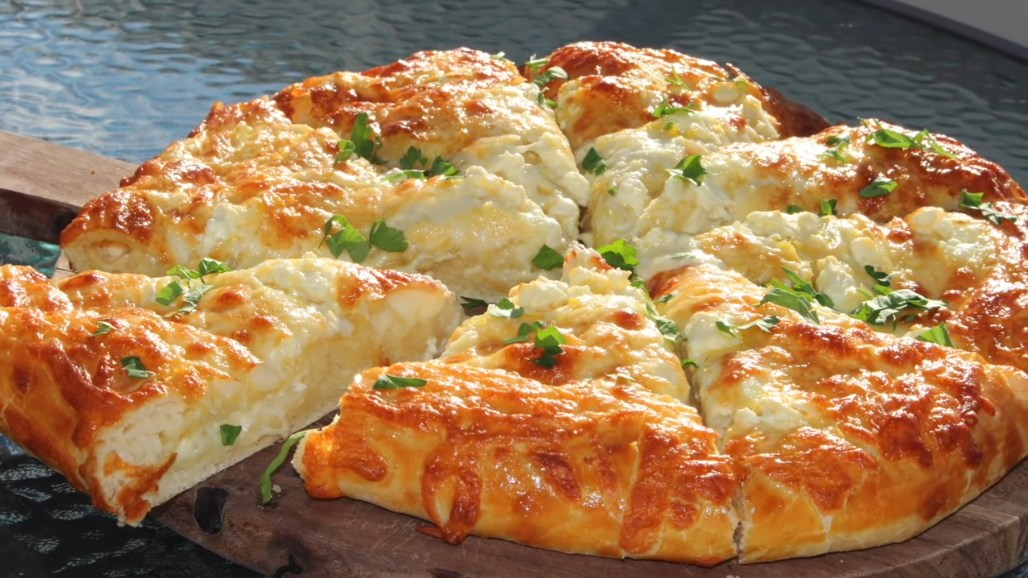 Lepo promešajte. Sipajte u tepsiju koju ste premazali puterom i posuli brašnom. Pospite sa rendanim čedar sirom (100 g). Pecite u zagrejanoj rerni na 180 stupnjeva oko 35 minuta.