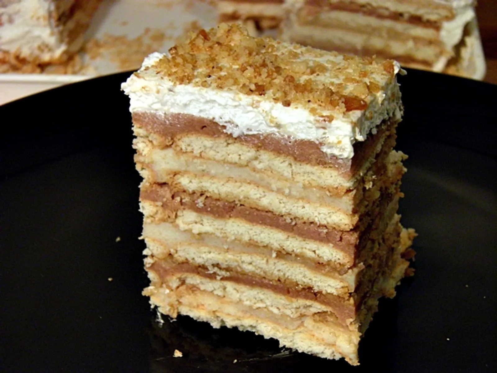 Petit keks namoćiti u mlijeko( može se umakati i u kavu) i redati ga tacnu ili tepsiju,gore staviti topli bijeli fil,posuti sa krokantom, red namočenog petit keksa pa crni fil,krokant i tako redom dok se ne potroši.Kad je gotovo možete posuti sa orasima ili šlagom ili po želji