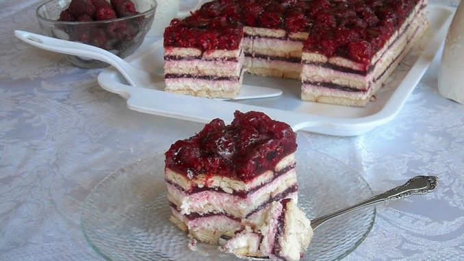 Na tacnu staviti red keksa ( 20 x 30 cm), premazati sa 1/2 belog fila. Preko satviti 1/2 fila od malina ( ne dozvoliti da se do kraja stegne već toliko kako možemo mazati preko fila), drugi red keksa, 2/2 belog fila, 2/2 fila od malina i treći red keksa. Keks se ne potapa ni u kakvu tečnost.