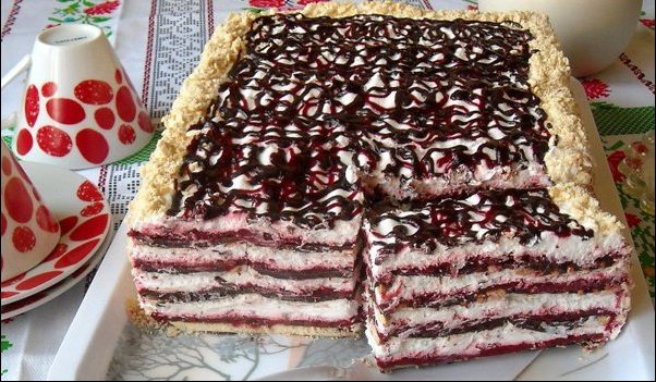 Opet red keksa, preliti 100 grama istopljene čokolade sa 2 zlice ulja, 2 deo fila od malina, sloj šlaga, keks preliven sa 100 grama istopljene čokolade, 3 deo fila od malina, sloj šlaga, keks preliven sa 100 grama čokolade, 4 deo fila od malina i premazati preostalim šlagom. Ukrasiti po želji.