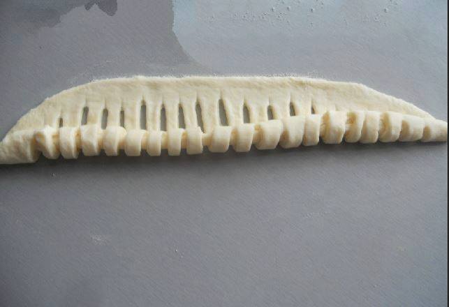Zamijesite tijesto i ostavite da naraste. Tijesto podijelite na loptice. Svaki dio razvaljajte u elipsasti oblik, vodoravno isijecite na trakice ne do kraja i uvijte.
