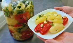 Ovu mjesavinu dobro promijesajte dok se secer i so potpuno ne otope, pa je prelijte preko pripremljenih paprika. Sve zajedno lagano promešajte, poklopite posudu i ostavite da stoji preko noći. Povremeno otvorite i ponovo promešajte sadržaj, kako bi se paprike ravnomerno marinirale i upile aromu.