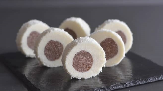 Stavite valjak preko i urolajte. Stavite u zamrzivac na pola sata, onda ga uvaljajte u kokos i sijecite.