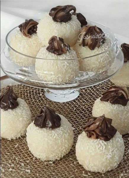 Svaku lopticu uvaljajte u kokos. Napunite sprejom za trtu sa masacem od kikirikija. Malo ohladite i spremno je za jelo.