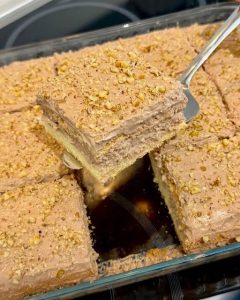 Kolač se zatim ostavlja da odstoji u frižideru, najbolje preko noći, kako bi se svi slojevi lepo sjedinili i fil stegao. Kolač možete ukrasiti sa mljevenim lješnaciama ili orasima po vašoj žlji.