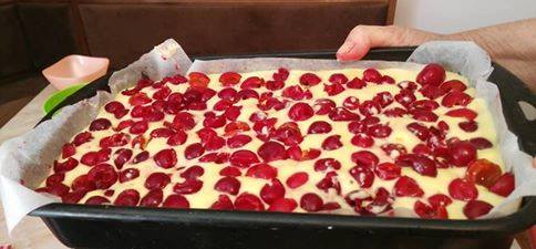 U zdjeli pjenasto umutite jaja sa secerom i vanilin secerom. Miksajte mikserom dok ne dobijete glatku smjesu. Uz neprestano miksanje dodajte ulje i jogurt. na kraju dodajte brasno pomijesano sa praskom za pecivo. Tijesto dobro sjedinite. Pripremljeno tijesto izlijte u kalup oblozen pek papirom. Preko smjese poredajte visnje. Kolac pecete u zagrijanoj rerni na 180 stepeni oko 30 minuta. Gotovi kolac pospite sa prah secerom i isjecite na kocke.