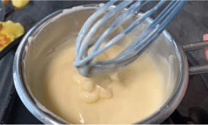 Kada ste pripremili smjesu krećemo sa pripremom kreme koja će nam biti potrebna kako bi smo ovom kolaču dodali osjećaj svježine. U zdjeli izmiksajte jogurt sa šećerom. jada ste izmiksali dodajte i jaje a zatim i narendanu koricu limuna.