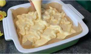 Kada su oba sloja spremna, sledi slaganje kolača. U tepsiju koju ste prethodno obložili pek papirom sipajte pripremljeno tijesto i ravnomijerno ga rasporedite po dnu. Potom, preko njega pažljivo kašikom nanesite smijesu od jogurta i limuna. Pomoću špatule poravnajte površinu, ali nemojte previše miješati slojeve – blago mramorni izgled kolača nakon pečenja upravo doprinosi njegovoj vizuelnoj privlačnosti.